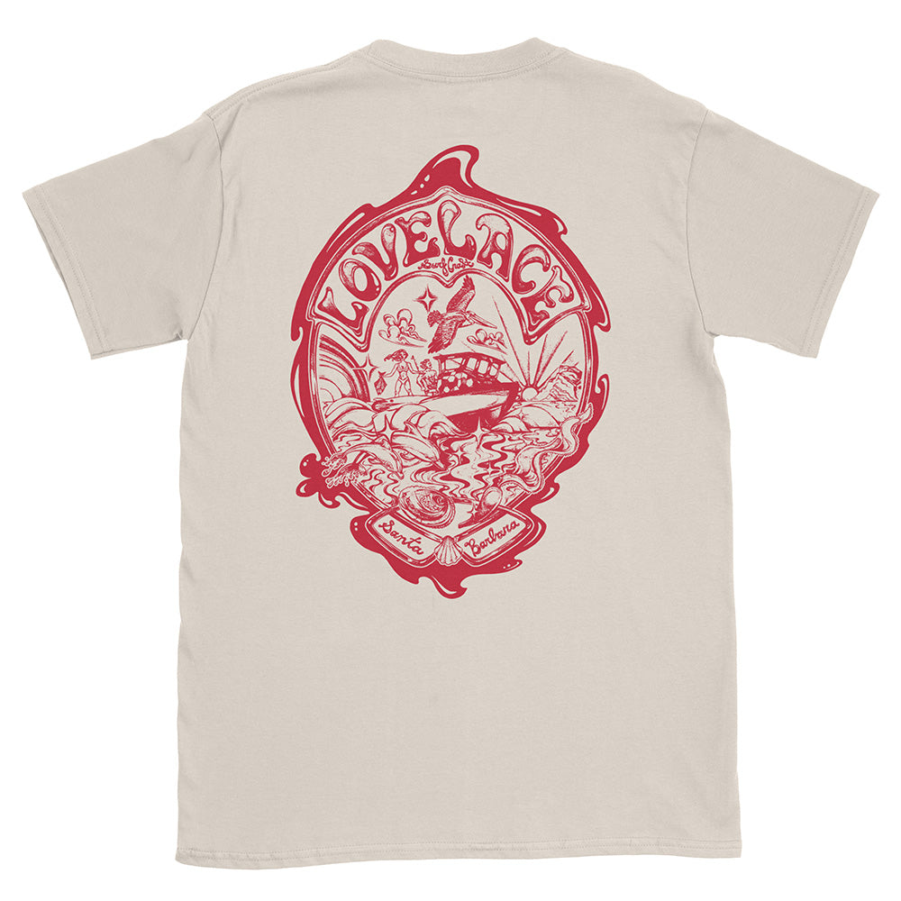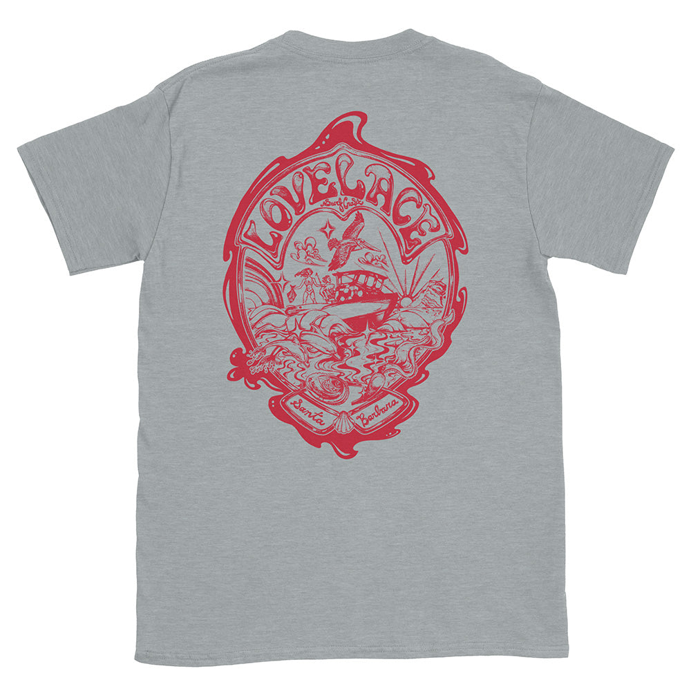 Ryan Lovelace is in his second decade of partnership with True Ames Fins. With some freshly released templates and True Ames recently becoming a neighbor to Lovelace Surfcraft in Carpinteria, we felt it fitting to collaborate on a T-Shirt. Katie Lovelace is not only the better half of Mr. Ryan, she is also a very talented artist. Katie took pen to paper and designed this elaborate story graphic, awesomely representing the core Lovelace pursuit, all things ocean.