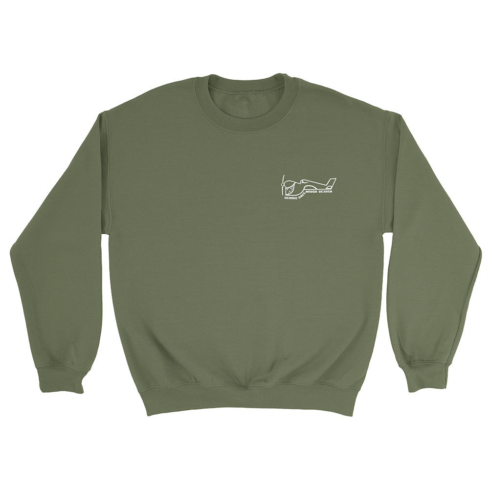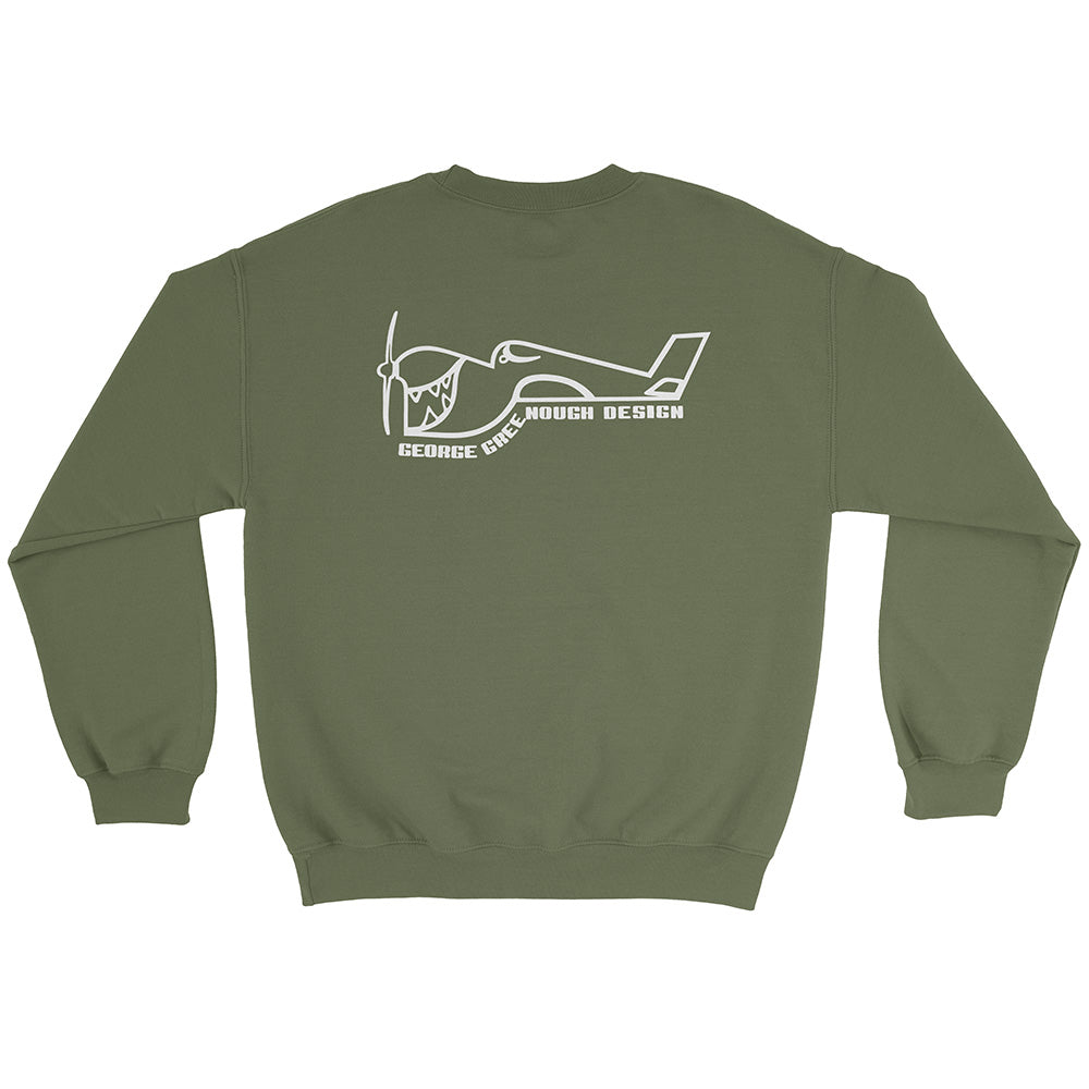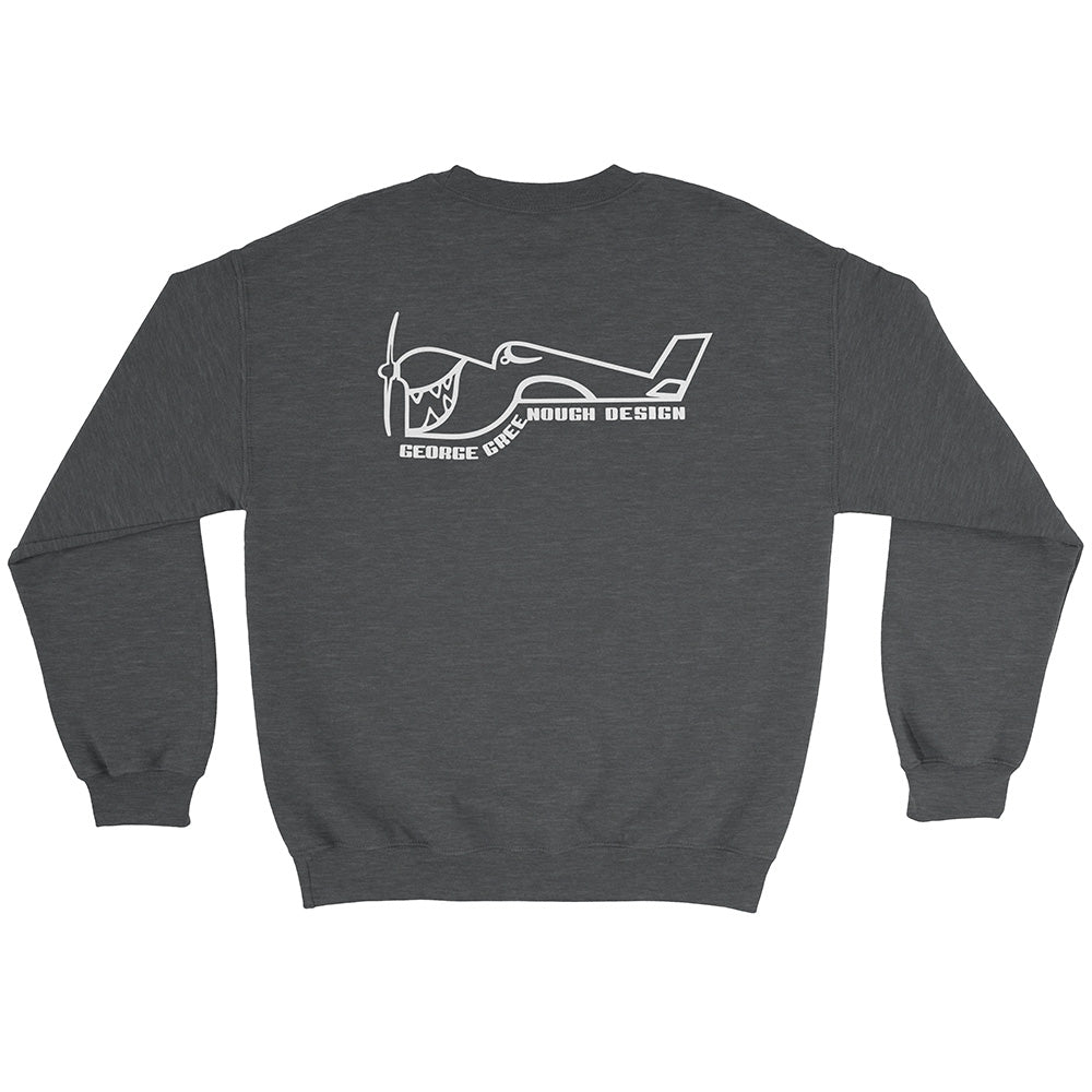 Few have had more of an impact on surfing and wave-riding performance capability than George Greenough, whose revolutionary fin designs are reminiscent of the wings of an airplane–they produce heaps of power and lift with minimal drag. This crewneck sweatshirt features Greenough’s iconic airplane logo in both a large back print and a small front print on the left chest.