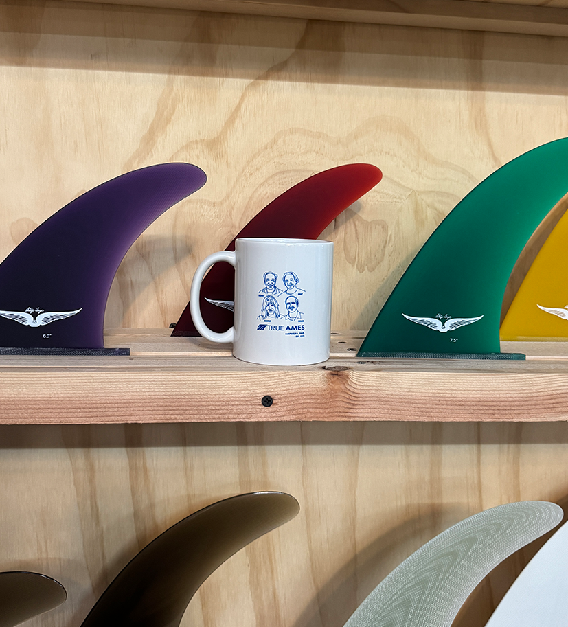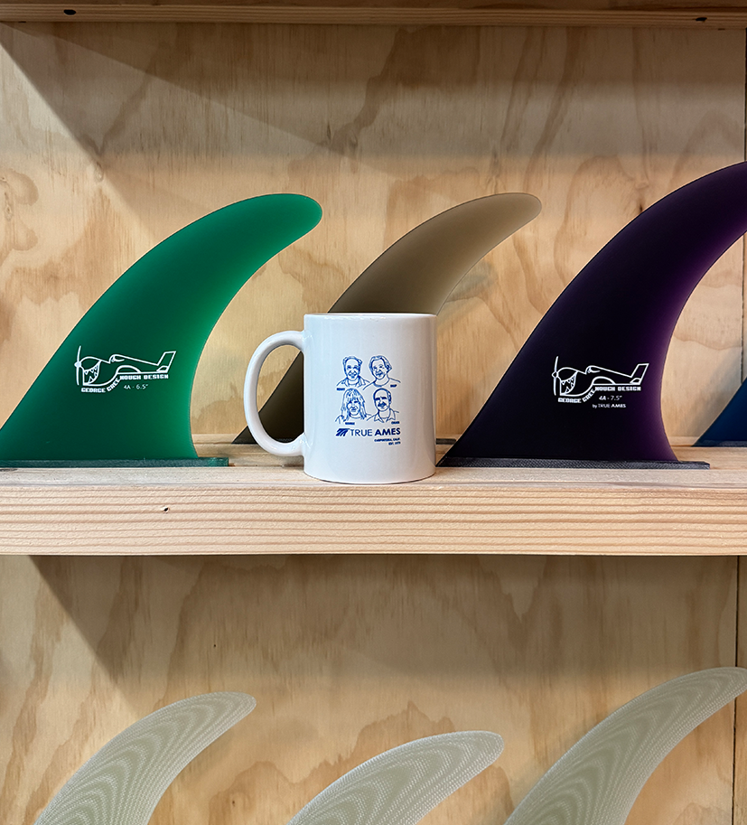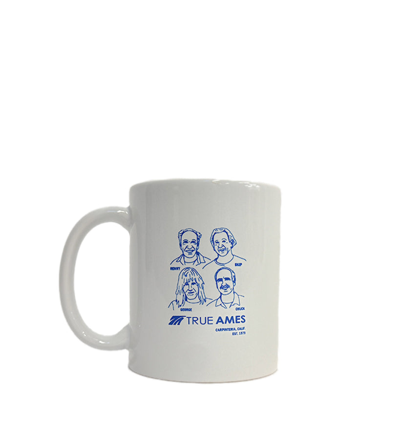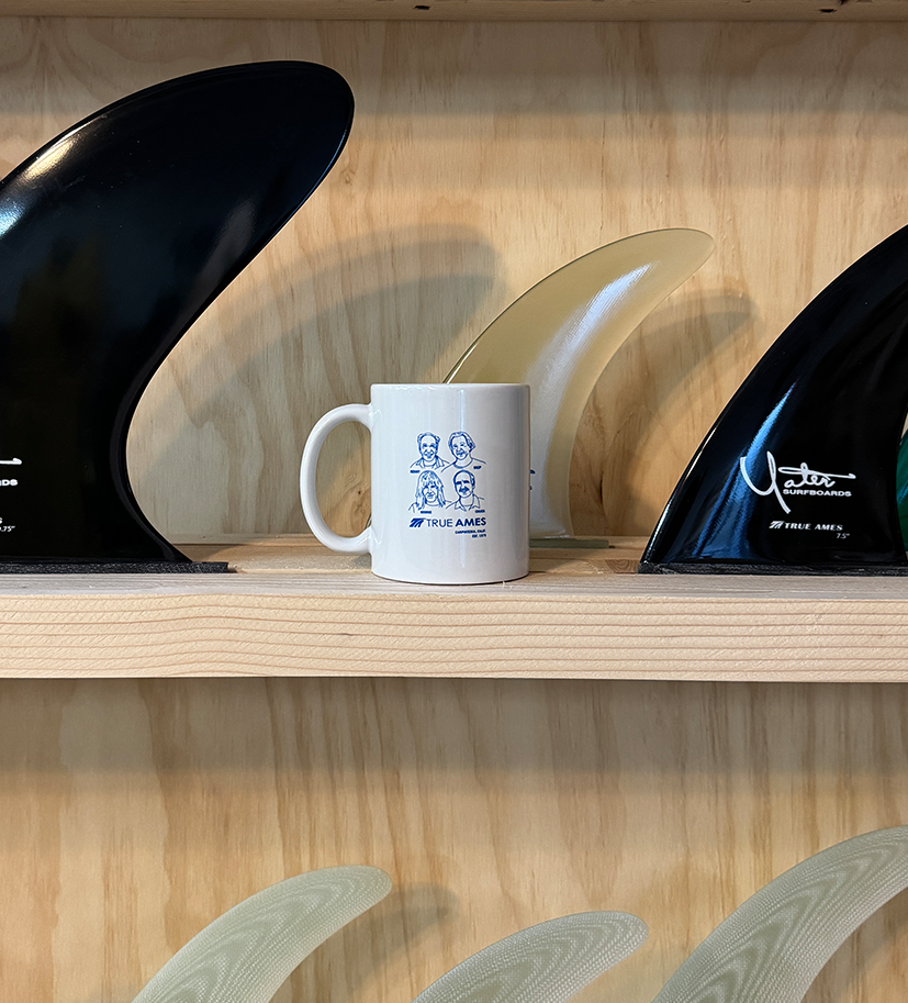 Just your classic as ever c-handle 11oz mug. Coffee, tea, hot chocolate, any beverage really. Rocking our ode to the greatest quartet of fin designers we've come across, our Western Chuck Exchange, aka the Mount Chuckmore, and pillar of True Ames efforts for the last 45 plus years - Renny Yater, Skip Frye, George Greenough, and the man himself...Chuck Ames.