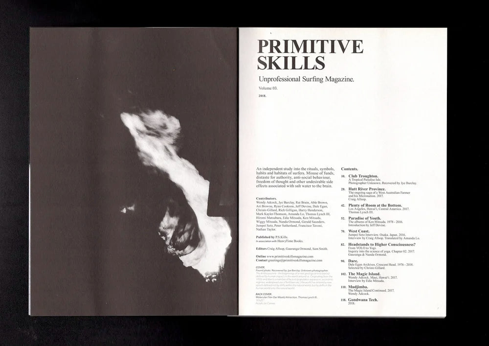 The third embodiment of Primitive Skills, the high-minded, independent, sub-surf culture magazine is now. It begins with Jye Barclay at Club Troughton, a tropical paradise isle. Craig Allsop covers the ongoing saga of a West Australian farmer & his micro nation. There’s Plenty of Room at the Bottom with Thomas Lynch III. Jeff Devine introduces Ken Mitsuda & the Paradise of Youth. Jumpei Seto shares his unfinished series West Coast. Brothers Ormond inquire further into the science of yoga in YOLO to Yogi Part Two. Boss DJ Christo selects treasures from the archives of Dale Egan. From LunarTec to Gondwana Tech and a survey of interpretive innovation. Finally we reach The Magic Island where Wendy Adcock recalls her days on the run with Peter Troy.