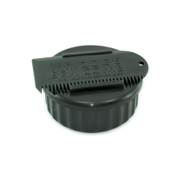 The Sexwax Wax Container prevents wax from melting or getting dirty. It features a rigid plastic base, a flexible interior bladder, and a black snap-on rubber cap with an attached Wax Comb. The unique bladder design allows for easy extraction of melted wax once it has solidified.